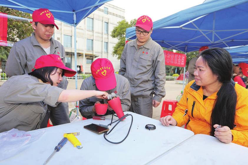 “小伙子,這個(gè)電烤箱壞了,你看能修好嗎?”“沒問題,我?guī)湍愣??!薄斑@些相片可以幫我過塑嗎?”“可以,馬上就給您過塑”……上午9時(shí)許,活動(dòng)剛剛開始,廣場上就聚集了許多群眾,面對群眾的每一個(gè)困難或疑問,志愿者都熱情解答,并一一動(dòng)手解決。